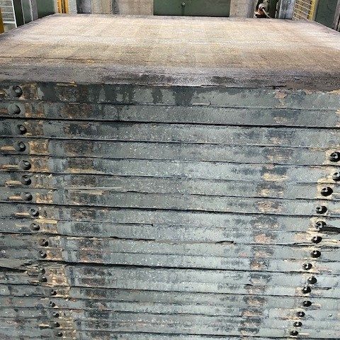 The wooden core is made of precisely selected planks with predominantly vertical annual rings, which significantly reduces pallet deflection under load. This construction ensures high stiffness, dimensional stability, and consistent performance, even in intensive vibration processes on Hess concrete block machines.